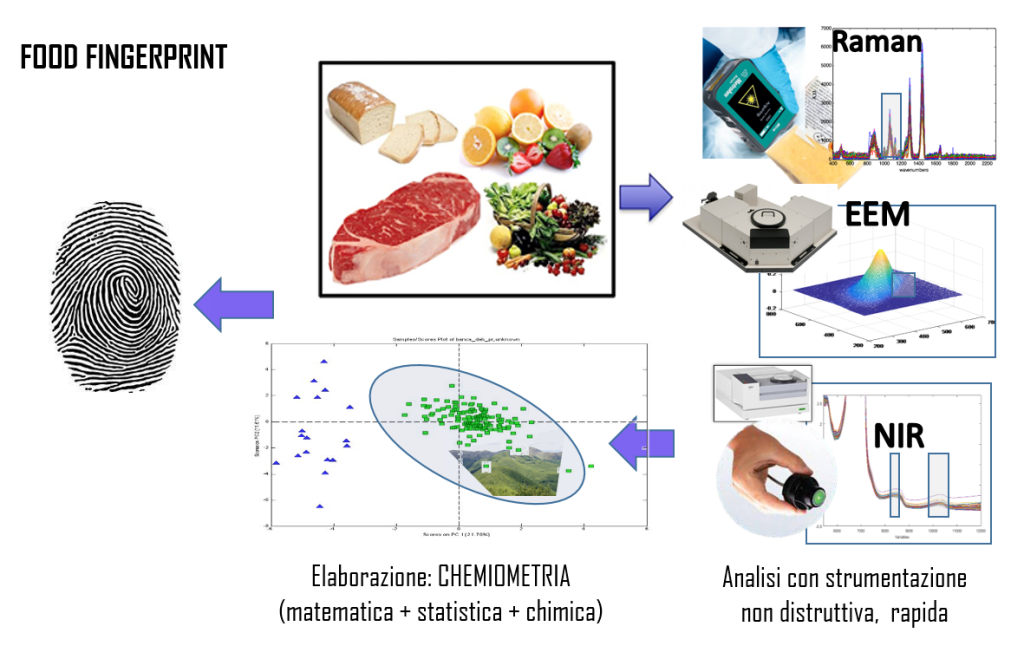 Per sviluppare metodologie analitiche per garantirne l’autenticità e criteri oggettivi da affiancare alla tracciabilità cartacea. Vi sono due approcci principali: 1) misurare indicatori direttamente riferibili al suolo/clima quali metalli, isotopi stabili (preparativa complessa e costi elevati); 2) impiegare tecniche veloci, non distruttive, quali spettroscopia nel vicino infrarosso, Raman, sensori (in-situ, basso costo), front-face fluorescence ed analisi chemiometrica per ottenerne un’impronta digitale . Il secondo approccio (food fingerprint) è adatto per uno screening esteso alla produzione/vendita (complementare al primo che può dare analisi di conferma) e può essere integrato dall’analisi foodomics (NMR, high resolution MS) per la valutazione del profilo compositivo. Critica in questo approccio è il supporto chemiometrico, ovvero la scelta e validazione dei metodi di data processing e class modeling.